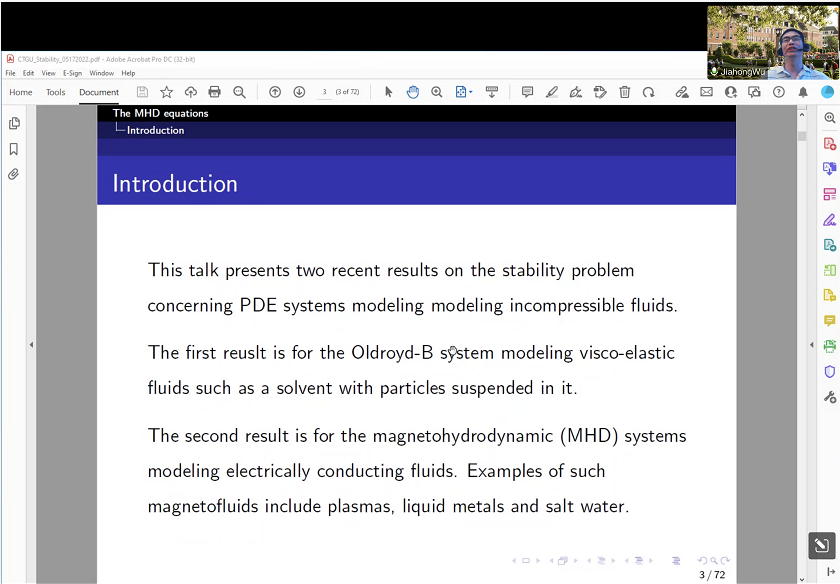 吴家宏教授在报告中通过列举两个例子,说明偏微分方程的耦合可以防止潜在的有限时间内奇点的形成,使系统具有光滑和稳定效应,结果表明磁场可以使流体具有稳定性。报告结束后,参会的学者与吴家宏教授就相关问题进行了积极的提问与交流。