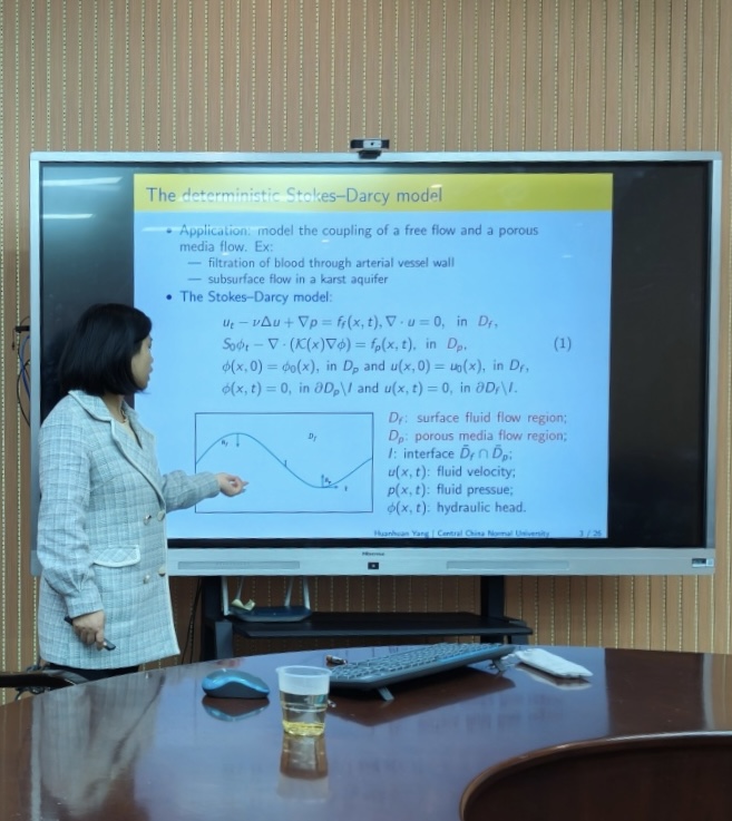 近日,应三峡数学研究中心邀请,华中师范大学数学与统计学学院杨欢欢副教授为我院师生带来了题为《Decoupling Algorithms for Ensemble Simulation of Stokes-Darcy Flow》的学术报告。理学院相关师生在理科楼L1218会议室现场聆听了报告。