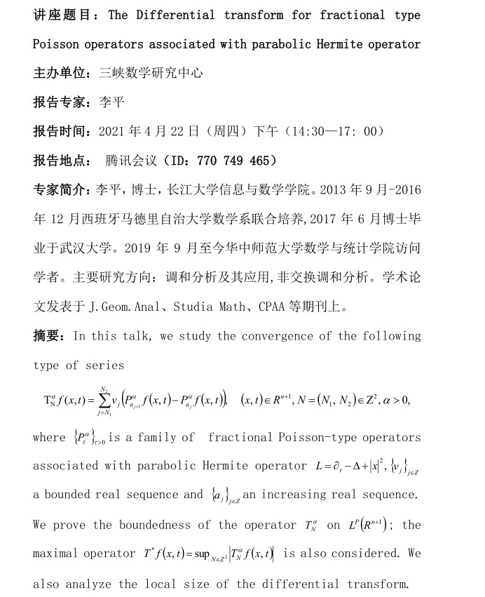 The Differential transform for fractional type Poisson operators associated with parabolic Hermite operator 李平博士
