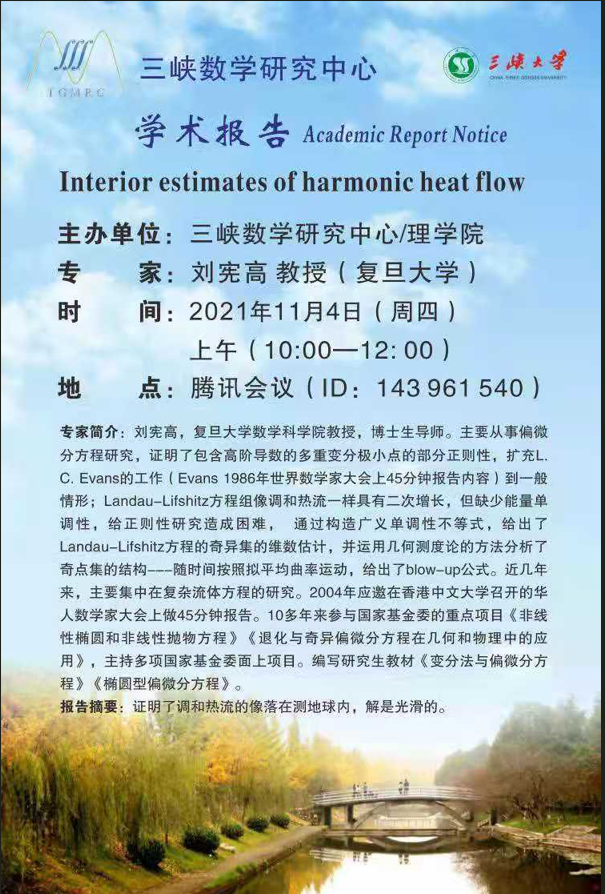 Interior estimates of harmonic heat flow 刘宪高教授(复旦大学)